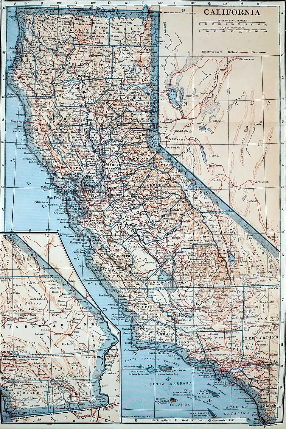 History.—The name California was applied to an island in the Pacific in 1521, and, sometime between 1535 and 1549, was also applied to that part of North America now known as California and Lower California. Several Spanish and English explorers visited this section during the 16th and 17th centuries, and in 1769 the Franciscan monks founded San Diego and soon afterward many other missions, including Dolores at San Francisco, 1776. In 1826 the first American emigrant train entered the present limits of the State, and in 1840 Monterey was made the capital. The United States tried to form an alliance with California in 1846; but the Americans already settled there seized Sonoma and proclaimed a republic. At the outbreak of the Mexican War, San Francisco was seized by the Americans, and, on Aug. 15, 1846, California was declared United States territory. In 1848 gold was discovered, and this led to a great immigration. In less than four years there were 250,000 people in the State. Many of these were lawless and capable of any crime, and several times vigilance committees were organized by the better class for active measures in the suppression of crime. California was admitted to the Union as a Free State, Sept. 9, 1850. In 1869 the Central Pacific Railroad was completed, and the employment of Chinese in this work led to serious riots, and resulted in the passage by Congress of the Chinese Exclusion Act. During the Spanish-American War and the American operations against the Filipino insurgents, nearly all the expeditions to the Philippine Islands started from San Francisco. Agitation against the immigration of Japanese laborers, which became acute in 1912 and the year following, and which was quieted by a compromise between the American and Japanese Governments, again became a source of irritation in 1920. The action of the United States Government in practically debarring Japanese immigrants from California was bitterly resented by the Japanese people.