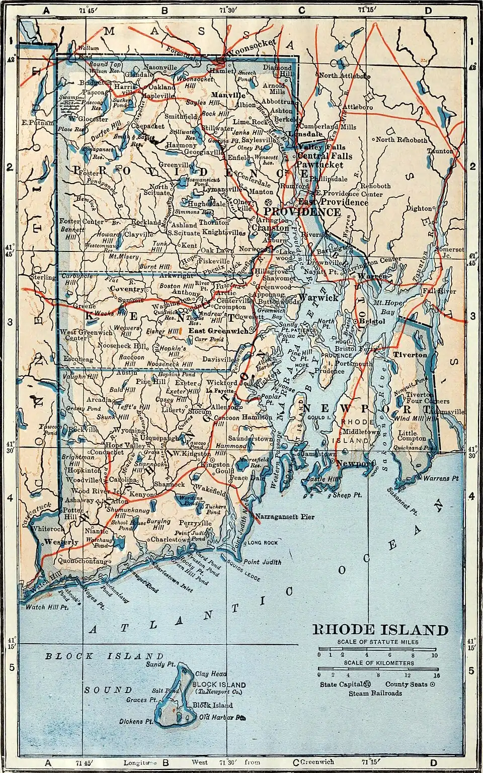 Topography.—The State is divided into two unequal parts by Narragansett Bay, which extends inland about 30 miles. The surface of the W. portion or mainland is hilly, but the hills are all low; the greatest height, Durfee Hill, having an altitude of 805 feet. There are numerous salt marshes along the ocean. The E. part consists mainly of islands. Of these the largest and most important is Rhode Island from which the State derives its name. Others are Conanicut, Hope, Patience, Starved Goat, Prudence, Perry, Dyer's, and Dutch Islands. The principal rivers are the Pawtucket, navigable as far as Pawtucket, where it changes its name to Blackstone, the Pawcatuck, forming part of the boundary between Rhode Island and Connecticut, and the Pawtuxet, flowing across the central part of the State, and emptying into the Providence river, an arm of the Narragansett Bay. There are numerous coves and bays branching off from Narragansett; among them being Greenwich bay, Sexonnet river, Mount Hope bay, and Providence river. Block Island, 10 miles from the coast, belongs to the State.