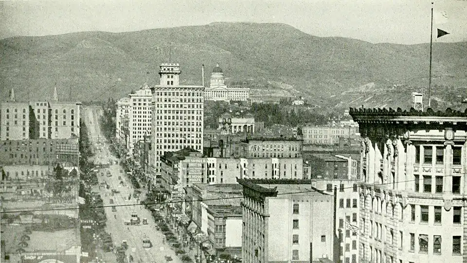 | A VIEW OF SALT LAKE CITY, UTAH, SHOWING MAIN STREET, WITH THE WASATCH MOUNTAINS IN THE BACKGROUND |