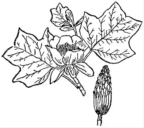 TULIP TREE, the Liriodendron tulipifera, one of the most magnificent forest trees of temperate North America; attaining in favorable situations a height of 100-190 feet, with a straight, clear trunk. It is the only species of the genus—which belongs to the Magnolia family—and may be recognized by its large three-lobed leaves, with the middle lobe cut square at the end, and large solitary tulip-like flowers having greenish sepals, and petals variegated with yellow and orange. The wood is highly esteemed, uniting lightness with strength and durability. It is of a pale-yellow color, fine-grained, compact, is easily worked, takes a good polish, and is therefore much used by house and bridge constructors, by cabinet-makers, coach-builders, implement-makers, etc., and by the Indians for canoes. The bark is officinal in the secondary list of the “United States Pharmacopœia” as a stimulant, tonic, and diaphoretic. The noble appearance of the tree led to its introduction over 200 years ago into Europe, where it is appreciated as a great ornament for pleasure grounds, etc. It is found from Vermont to Michigan and S. to Florida and Mississippi.