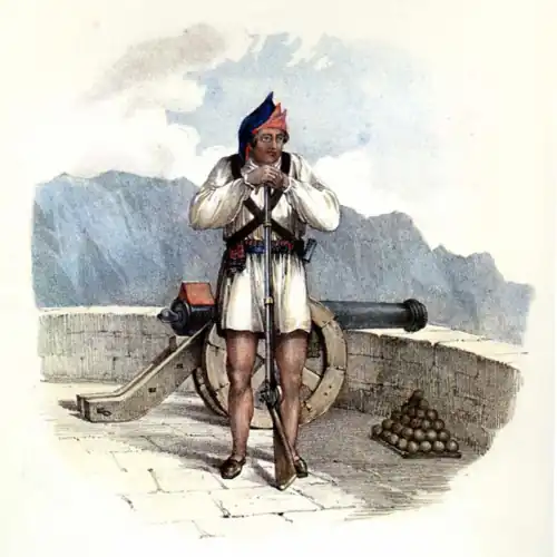 The uniform of this militiaman, needs little description, being nothing more than a shirt and white linen drawers of great width, with a Montero instead of a hat or helmet, in other words it is the common dress of the countrymen with the addition of a soldier's belt.