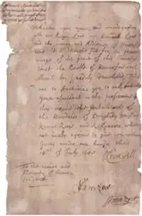 Whereas upon view, and consideration with Mr. Roger Lort, Mr. Samson Lort and the maior and Aldermen of Haverfordwest it is thought fitt for the preservinge of the peace of this Countye that the Castle of Haverfordwest should bee speedily demolished. Theise are to Authorise you to call unto your assistance in the performance of this service, the Inhabitants of the Hundreds of Daugleddy, Dewisland, Kemis, Roose and Kilgarren whoo are heerby required to give you assistance.