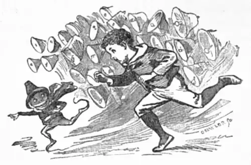 Davy began to feel in his pockets (which is a very difficult thing to do when you’re running fast), and found, to his astonishment, that they were completely filled with a most extraordinary lot of rubbish. First he pulled out what seemed to be an iron ball; but it proved to be a hard-boiled egg, without the shell, stuck full of small tacks. Then came two slices of toast, firmly tied together with a green cord. Then came a curious little glass jar, filled with large flies. As Davy took this out of his pocket, the cork came out with a loud “pop!” and the flies flew away in all directions. Then came, one after another, a tart filled with gravel, two chicken-bones, a bird’s nest with some pieces of brown soap in it, some mustard in a pill-box, and a cake of beeswax stuck full of caraway seeds. Davy remembered afterward that, as he threw these things away, they arranged themselves in a long row on the curb-stone of the street. The Goblin looked on with great interest as Davy fished them up out of his pockets, and finally said, enviously, “That’s a splendid collection; where did they all come from?”