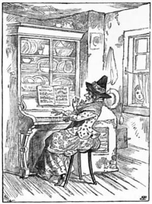 Davy stole softly to the kitchen window and peeped in, and, as the Cow had said, Mother Hubbard was there, sitting at the piano, and evidently just preparing to sing. The piano was very remarkable, and Davy could not remember ever having seen one like it before. The top of it was arranged with shelves, on which stood all the kitchen crockery, and in the under part of it, at one end, was an oven with glass doors, through which he could see several pies baking.
