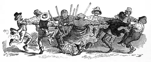 Davy and the Goblin now hurried off in pursuit of Gobobbles, and presently came upon the crowd of farmers who had joined hands in a ring, and were dancing around a large white object lying on the ground. Davy pushed his way eagerly through the crowd, expecting to see Gobobbles; but the white object proved to be the Cockalorum hemmed in by a ring of pitchforks sticking in the ground, and with his feathers more rumpled than ever.