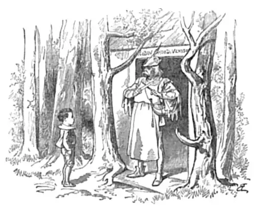 “I verily believe that was Little Red Riding Hood,” said Davy to himself, “and I never knew before that Robin Hood was her father!” The thought of Red Riding Hood, however, brought the wolf to Davy’s mind, and he began to anxiously watch the thickets on either side of the path, and even went so far as to whistle softly to himself, by way of showing that he wasn’t in the least afraid. He went on and on, hoping the forest would soon come to an end, until the path shook itself again, disclosing to view a trim little brick shop in the densest part of the thicket. It had a neat little green door, with a bright brass knocker upon it, and a sign above it, bearing the words:—
