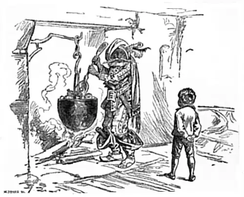 The place was so dark that at first he could see nothing, although he heard a rattling sound coming from the back part of the shop; but presently he discovered the figure of an old man, busily mixing something in a large iron pot. As Davy approached him he saw that the pot was full of watches, which the old man was stirring with a ladle. The old creature was very curiously dressed, in a suit of rusty green velvet, with little silver buttons sewed over it, and he wore a pair of enormous yellow-leather boots; and Davy was quite alarmed at seeing that a broad leathern belt about his waist was stuck full of old-fashioned knives and pistols. Davy was about to retreat quickly from the shop, when the old man looked up, and said, in a peevish voice:—