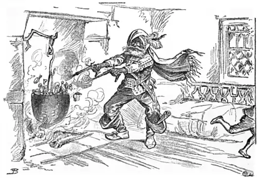 At this moment an extraordinary commotion began among the watches. There was no doubt about it, the pot was boiling, and Sham-Sham, angrily crying out, “Don’t tell me a watched pot never boils!” sprang to his feet, and, pulling a pair of pistols from his belt, began firing at the watches, which were now bubbling over the side of the pot and rolling about the floor; while Davy, who had had quite enough of Sham-Sham by this time, ran out of the door.