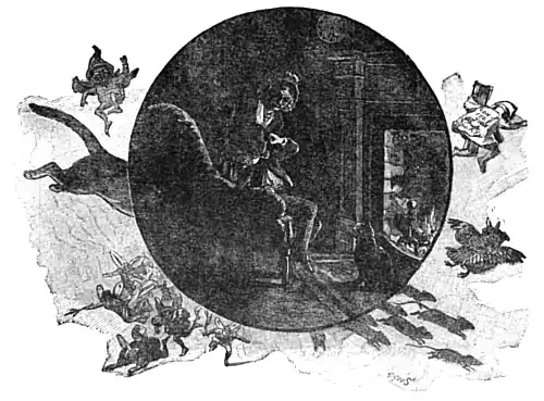 The Prime Minister gave a shriek, and fell flat on his face, and the Queen began jumping frantically up and down, and beating about on all sides of her with the end of the mullen-stalk, when suddenly a large Cat walked into the stable, and the fairies fled in all directions. There was no mistaking the Cat, and Davy, forgetting entirely the Goblin’s caution, exclaimed, “Why! it’s Solomon!”