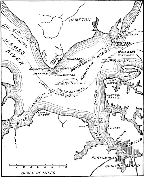 The commander of the Monitor had positive orders not to venture into the shoal water above Hampton Roads where the Union fleet could not support her, and the Merrimac had equally positive orders from the Confederate Navy Department not to go beyond a certain point, through fear that she might be disabled by the fire of the forts where no aid could reach her.