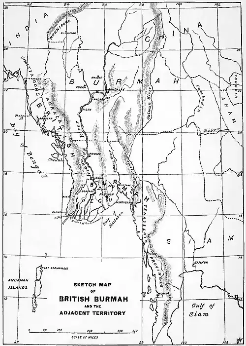 While the British in the early part of the present century were extending their boundaries in the northwest provinces of India, the kingdom of Burmah displayed a desire to aggrandize some of the region lying to the south of the company's territories. About 1798 some 30,000 Mugs, inhabitants of Arracan, in Burmah, fled from the oppression of their Burmese masters and sought refuge in Chittagong, a possession of the British. Several attempts were made by the Burmese to secure the return of these fugitives, but without avail; between 1800 and 1813 five or six embassies were sent by the Burmese government to that of India with this object in view, but all failed of their purpose. Then all was quiet for a time, save that there were occasional raids of very little consequence along the frontier. In 1822 the Burmese adopted bellicose measures; they seized the island of Shahporee, at the entrance of the arm of the sea dividing Chittagong from Arracan, overpowering the British by a night attack and taking possession in the name of the Burmese goverment. When asked to explain his action, the governor of Arracan announced that his government had annexed the island, and unless the right of the Burmese to its possessions were admitted, the king of Burmah would send an army to invade the British territory. This plan of proceeding was not unlike that of more civilized countries, Great Britain among them, in carrying on the work of annexation, but when tried against the British it was certain to be resented.