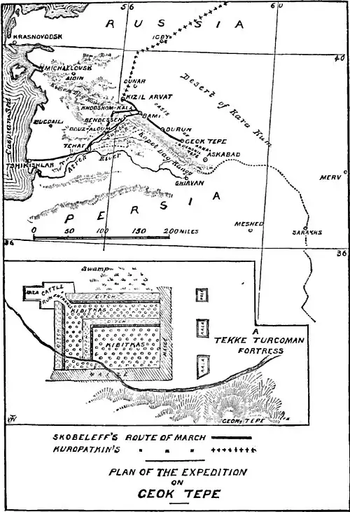 Skobeleff, seeing the vast difficulties of the situation, matured a skilful and scientific plan of operations, for which he obtained the imperial sanction by making a personal visit to Livadia, where the Emperor was then sojourning. His next step was to telegraph to General Kuropatkin, who was then on the Kuldja frontier, to join him with a detachment of troops from Turkestan. Kuropatkin marched from Tashkend to Khiva and thence to Bami, where he was to join Skobeleff; in spite of the difficulties of the route across the desert, he brought his troops through in fine condition and secured the profound admiration of all military men for his remarkable achievement. He was twenty-six days covering the distance between Khiva and Bami; the route was but little known and for much the greater part of the way it lies through a sandy desert where water can only be found at long intervals.