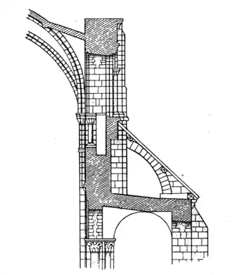 FIG. 6.A beginning was made in the direction of further progress when the Romanesque builders began to vault their naves. It was then found that the pilaster buttress against the clerestory wall was not enough to stay vaults of so much wider span than those of the aisles for which a buttress like that shown in Fig. 6 had been adequate. Expedients to augment the resistance of the clerestory buttress were accordingly resorted to which were destined ultimately to yield unforeseen results.