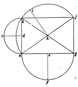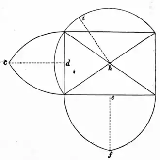 FIG. 9. which spanned the longer sides. While if full semi-circular arches were used for the diagonals of such vaults their crowns would reach highest of all. Thus in Fig. 9 the height c d of the arch a c b is less than f e, the height of the arch a f g, which again is less than i h, the height of the arch a i j. A vault constructed upon such a system of arches must have an excessively domed form. To obviate this, in part, the expedient was adopted of stilting the narrow arches. The point of their springing was raised to a level considerably above the springing of the greater arches, so as to bring all the crowns nearer to the same height, and thus to reduce the amount of doming required. But even with this modification a vault over an oblong compartment, upon a system of round arched ribs, is excessively heavy, exerts powerful thrusts, and presents an awkward appearance. Oblong groined vaults, though sometimes constructed, were therefore usually avoided by the Romanesque builders, who, indeed, had rarely vaulted their naves, the portion of the building where, in North-Western Europe, oblong compartments most frequently occur. They contented themselves with vaulting the aisles whose compartments were commonly square, and where groined vaults, on round arches, were easily constructed and easily rendered secure. [10]