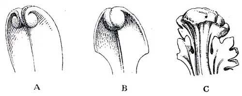 This Corinthianesque type of capital became at once the leading type in Gothic architecture, and almost countless varieties of it were wrought in the Ile-de-France during the twelfth and thirteenth centuries. The outline of the leaf was soon changed from the form A, Fig. 177, which is that of
