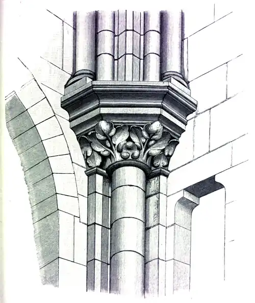 The Cluniac sculptors of Burgundy appear to have been the first to break away, in some measure, from lifeless traditions in the carving of leafage. The capitals of the porch of Vézelay, begun in 1132, and those of the nave of the nearly contemporaneous Cathedral of Autun, distinctly exhibit, in the acanthus-like foliage with which they are