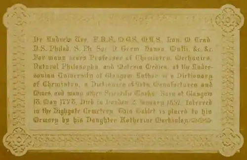 Although in infirm health for some years past, Dr. Ure retained his mental energy, and his conversation was always most interesting and instructive. Distinguished as a sound chemical philosopher, his information was not confined to scientific subjects alone. He was a good linguist, and a fair classical scholar; deeply read also in Theology and Biblical criticism; and well acquainted with Foreign, as well as English Literature. Dr. Ure was elected a Fellow of the Royal Society in 1822. He was one of the original Fellows of the Geological Society; he also belonged to the Astronomical Society, and was a Member of several scientific bodies in this country and abroad.