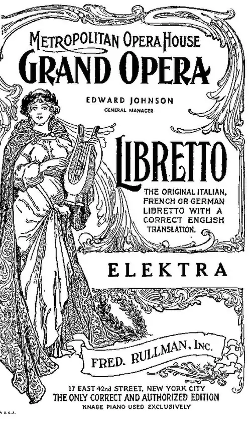 The scene represents the rear of the palace of old King Agamemnon, with its courtyard and servants' quarters. King Agamemnon is dead, having been murdered by Aegisthes, the paramour of his Queen Klytaimnestra. He has left three children: Orestes, the son, and two daughters, Chrysothemis and Elektra. All three children have been cruelly treated both by their mother and the usurper Aegisthes. Orestes has been banished and Elektra is barely tolerated about the royal establishment. All three children know of the murder of their father, and their hate of their mother is only equalled by their fear of her and the tyrant Aegisthes. Elektra, by brooding over her parent's death and the awful crime of her mother, is bent upon avenging the murder of the old king. Klytaimnestra, constantly haunted by her sin and living in dread of the return of Orestes, appeals to Elektra to tell her by what new sacrifice of human blood she may know once more the peace of sleep. Elektra denounces her and draws a vivid picture of the fate which awaits her at the hands of the avenger when he shall return. Klytaimnestra is informed that two messengers, an old man and a youth, have brought the welcome news that Orestes is dead. Elektra's sister informs her that all the palace has now heard the tidings, but Elektra will not believe that her brother is dead. She urges Chrysothemis to assist her in avenging the murder of their father, but the weaker sister shrinks from the task. The youth who has accompanied the old messenger appears in the court. He is Orestes himself. The brother and sister do not recognize each other at first, but when they do, Elektra realizes that the hour has come for which she has longed. She is so different from the happy child that Orestes remembers, and she deplores to him the cruelty she has suffered at the hands of her mother and Aegisthes. Orestes and the old man are now summoned to an audience with Klytaimnestra, who wishes to hear from their own lips the news of Orestes' death. No sooner have the two entered the palace than Klytaimnestra is heard to scream, and Elektra, waiting anxiously, knows that Orestes has avenged the crime. A fight ensues in the palace, some of the servants taking the part of Orestes and others the part of the dead Queen. The tyrant Aegisthes arrives, is greeted by Elektra, who leads him to the door of the palace, and unsuspecting, he enters to meet his doom at the hands of the avenger. Elektra's joy is unbounded; as she is urging her sister and the servants to join her in the dance of triumph, her physical strength gives way and she sinks prostrate to the ground.