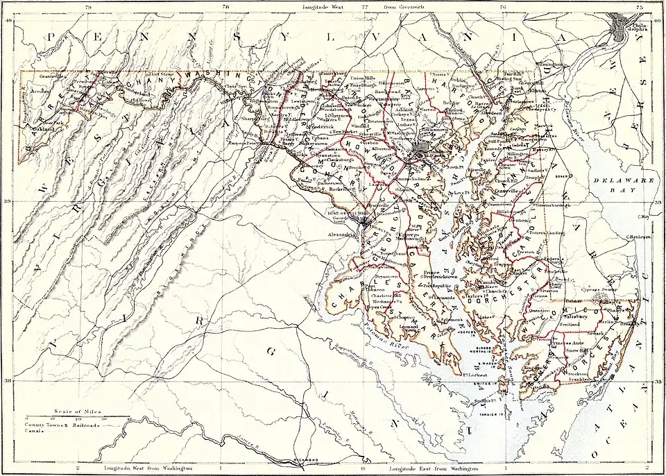 Plate VIII. MARYLAND, one of the thirteen original States of the American Union, lies between the parallels of 37° 53' and 39° 43' 26" N. lat., and 75° 4' and 79° 33' W. long. It is bounded on the N. by Pennsylvania and Delaware; E. by Delaware and the Atlantic Ocean; and S. and W. by Virginia and West Virginia. The total area of the State is 12,210 square miles, of which about 2350 square miles are covered by the waters of the Chesapeake Bay and of the Potomac and other rivers.