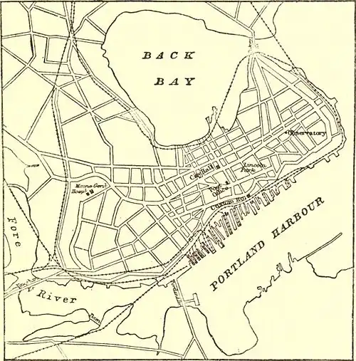 PORTLAND, a city and port of entry of the United States, capital of Cumberland county, Maine, lies on Casco Bay, in 43° 39' N. lat. and 70° 13' W. long. By rail it is 108 miles north-north-east of Boston and 297 south east of Montreal. The peninsula on which it is mainly built runs out for about 3 miles, has a breadth of about ¾ mile, and rises in the west to 175 feet in Bramhall's Hill and in the east to 161 in Munjoy's Hill, which is crowned by an observatory. As seen from the harbour, the whole city has a pleasant and picturesque appearance, and the streets are in many parts so umbrageous with trees that Portland has obtained the sobriquet of the “Forest City.” A large number of the houses are built of brick. Congress street, the principal thoroughfare, runs along the whole ridge of the peninsula, from the western promenade, which looks down over the suburbs from Bramhall's Hill to the eastern promenade, which commands the bay; it passes Lincoln Park (2½ acres) and the eastern cemetery, which contains the graves of Commodore Preble and Captains Burroughs and Blythe, of Revolutionary fame. On Bramhall's Hill is the reservoir (12,000,000 gallons) of the water company, which was established in 1867 to supply the city from Lake Sebago, whose beautiful expanse (14 miles long by 11 wide) was the favourite haunt of Nathaniel Hawthorne s boyhood. The more conspicuous buildings of Portland are the city hall (1859), with a front in olive-coloured freestone, 150 feet long; the post-office (1872), constructed of Vermont white marble in the mediæval Italian style; the custom-house (1872), in granite, with rich marble ornamentation in the interior; the marine hospital (1855), a large brick erection; the Maine general hospital, 1868; the Roman Catholic cathedral; the Roman Catholic episcopal palace; and several fine churches. The Portland Society of Natural History, established in 1843 and incorporated in 1850, though it has twice lost its property by fire (1854 and 1866), has again acquired very valuable collections. The Portland institute and public library, dating from 1867, had 30,000 volumes in 1884. A medical school was founded in 1858. Portland is in the main a commercial city, with an extensive transit trade, drawing largely from Canada and the Far West. Connected with Boston by rail in 1842, and with Montreal in 1853, it has now become a terminus of six different railroads; and, since the gauge of the Grand Trunk Rail road was altered, it can import direct from San Francisco. As the harbour (which lies along the south side of the city) is seldom closed by ice, it has been long used as the winter port for the great ocean steamers between Great Britain (Liverpool and Glasgow) and Canada, which in summer ascend the St Lawrence to Montreal and Quebec. At low water vessels drawing 22 feet and at high water vessels drawing 30 feet can come up to the wharves with safety in any season; and there is secure anchorage within a mile of the shore. The dry dock is one of the deepest in the United States. The following figures show the extent of the foreign trade:—