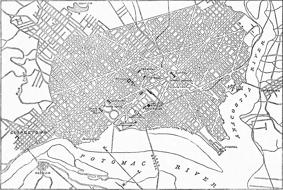 Washington was selected as the site for the federal capital in 1790. The States of Maryland and Virginia had ceded to the general Government a tract of land 10 miles square, lying on both sides of the Potomac, for that purpose. The Virginia portion was subsequently re-ceded to that State. In 1790 Georgetown was a city of considerable importance, but upon the site of Washington there were very few settlers. The plan of the city was drawn by Major l'Enfant, and the city laid out in accordance therewith by Andrew Ellicott. At that time the greater part of the site lying west of the Capitol was a morass, well-nigh impassable. The machinery of the government was moved to Washington in 1800, when it was “a backwoods settlement in the wilderness.” It existed principally upon paper, and the magnificence of the plan only served to emphasize the poverty of the execution. In 1814, during the second war with Great Britain, it was captured by the British troops, and the Capitol, together with most of the other public buildings, was burned. In 1839 it was described as a “large straggling village reared in a drained swamp.” Indeed, in 1871, although it had attained to considerable size, it was exceedingly backward in all municipal improvements. The public buildings and grounds were neglected. The streets were deep in mud, or clouded with dust; the unbuilt portions were morasses; and the sewerage was worse than useless. In that year Congress abolished the charters of the two cities, and instituted a form of territorial government, with a governor and a legislative assembly. The matter of municipal improvement was placed in the hands of a board of public works, with authority to carry out a comprehensive scheme. The work was commenced and pushed forward with the greatest energy, and almost fabulous results were achieved. In a very few years the appearance of the city was revolutionized. The cost of these improvements, was, however, enormous, and it was increased greatly by the rapidity with which the work was done. Much of it, too, was badly executed, so that it has been necessary to replace it. But, in spite of these drawbacks, the fact that Washington is one of the most beautiful and comfortable cities in the world is principally due to the first governor of the District and his board of public works. This government lived too fast to live long. In 1874 Congress abolished the territorial form, and established the present government by three commissioners.
