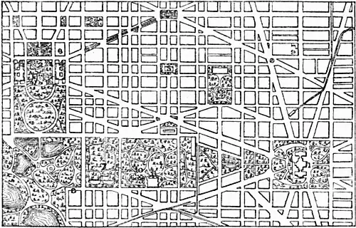 The plan of the city is regular and symmetrical. Radiating from the Capitol are three streets, running north, south, and east, and known respectively as North, South, and East Capitol Streets. These, together with a line of public parks running west from the Capitol, divide the city into quarters, known as the north-west, north-east, south-east, and south-west quarters. The streets run in the cardinal directions, the north and south ones being designated by numbers, and the east and west ones by the letters of the alphabet, — the numbers increasing eastward and westward from the meridian of the Capitol, the letters progressing northward and southward from a parallel through that building. In addition to these streets, there is a system of avenues, which run diagonally to the cardinal directions, and which bear the names of States. The intersections of the streets and avenues have given opportunity for the construction of many small parks in the forms of triangles, circles, quadrilaterals, &c., which, with the numerous larger parks scattered about the city, add greatly to its beauty and healthfulness. The streets have a total length of 233½ miles. They are wider than in any other city on the globe, the avenues ranging in width from 120 to 160 feet, while the streets range from 80 to 120 feet. The area comprised in the streets, avenues, and public parks is considerably more than half the area of the city. As the width of the streets is in most cases in excess of the demands of travel, a portion of this width has, in the residence streets, been left between the side walks and the houses, and has been improved as a public parking. In some cases, similar parking has been left in the middle of the streets. Of the 233½ miles of streets, 30 per cent. are paved with smooth pavements, either asphalt, coal-tar, concrete, or asphalt blocks; 10 per cent. are paved with granite or trap blocks, and an equal extent with cobble or rubble; 4½ per cent. are macadamized, and 14 per cent. are gravelled, while the remainder are unimproved. The paved streets are swept by machinery at frequent intervals. With the exception of the business streets every street is lined with shade trees, which, arching over the pavements, form continuous shade for miles. The trees are mainly elms and maples.