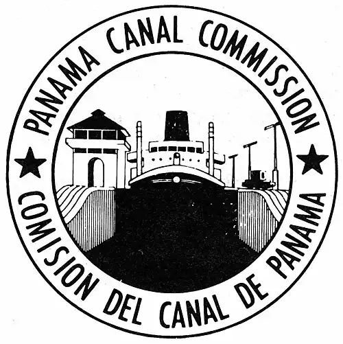 - A view of a lower lock chamber of the Panama Canal, showing the bow end of a ship in an upper chamber, behind a closed gate, flanked on the left by a control house and on the right by a towing locomotive and three lamp standards. The ship colors to be dull red hull with white trim, white superstructure, white king posts, and gray funnel. The lock walls, control house and lamp standards to be white. The control house roof to be dull red. The lock gate and towing locomotive to be gray. The sky to be light blue and the water to be azure blue. All to be encircled with a white band edged in navy blue and containing the inscription ‘‘PANAMA CANAL COMMISSION * COMMISSION DEL CANAL DE PANAMA *’’ in navy blue letters.