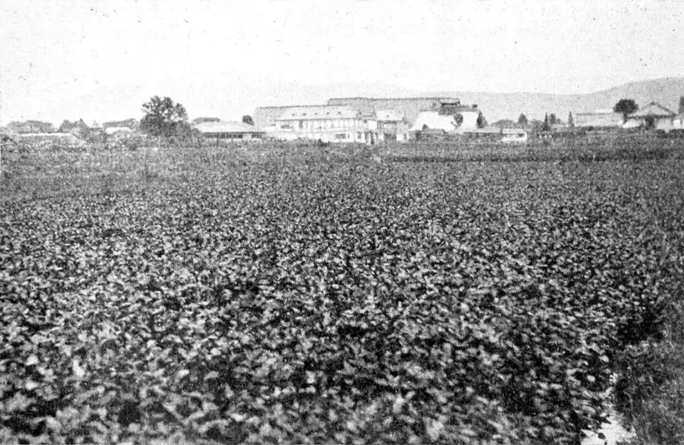 When returning toward Moji to visit the Agricultural Experiment Station of Fukuoka prefecture, the rice along the first portion of the route was standing about eight inches above the water. Large lotus ponds along the way occupied areas not readily drained, and the fringing fields between the rice paddies and the unfilled hill lands were bearing squash, maize, beans and Irish potatoes. Many small areas had been set to sweet potatoes on close narrow ridges, the tops of which were thinly strewn with green grass, or sometimes with straw or other litter, for shade and to prevent the soil from washing and baking in the hot sun after rains. At Kitsu we passed near Government salt works, for the manufacture of salt by the evaporation of sea water, this industry in Japan, as in China, being a Government monopoly.