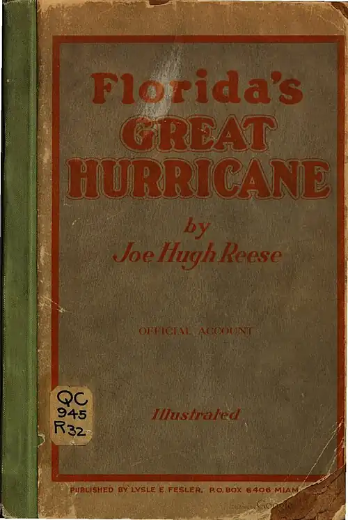 This is to certify that the author of the volume to be known as "Florida’s Great Hurricane," Joe Hugh Reese, spent many hours in my office, collating data concerning the hurricane or September 18, 1926, and other hurricanes of importance; that personally I assisted him in drafting the drawings and other matter to be presented in his book, and revised that part of his manuscript relating to the official record of the storm. It gives me pleasure to state that this information is accurate and correct, and, so far as I am informed:
