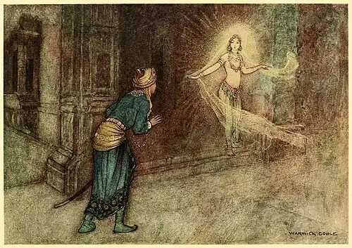 prince went the rounds, and when he came near the gate of the palace where his father lived, he saw a beautiful woman coming out of the palace. The prince accosted the woman, and asked who she was and where she was going at that hour of the night. The woman answered, "I am Rajlakshmi,[1] the guardian deity of this palace. The king will be killed this night. I am therefore not needed here. I am going away." The prince did not know what to make of this message. After a moment's reflection he said to the goddess, "But suppose the king is not killed to-night, then have you any objection to return to the palace and stay there?" "I have no objection," replied the goddess. The prince then begged the goddess to go in, promising to do his best to prevent the king from being killed. Then the goddess entered the palace again, and in a moment went the prince knew not whither.