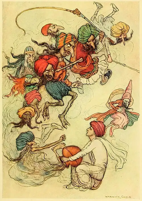 innkeeper and his family and belaboured them mercilessly. They also began upsetting the shop, and would have completely destroyed it, if the victims had not besought the Brahman, who had by this time returned from his ablutions, to show mercy to them and send away the terrible demons. The Brahman acceded to the innkeeper's request, he dismissed the demons by shutting up the vessel; he got the former handi, and with the two handis went to his native village.
