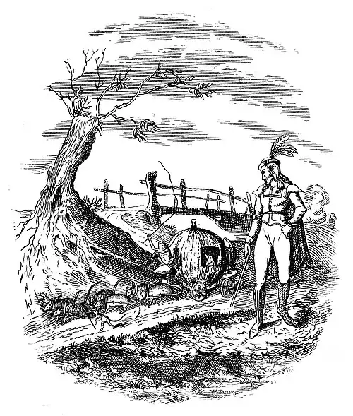 The prize was so tempting and the chance so fair for all, that none made any doubts about setting to work, each in his own way, to try and be the winner. The youngest was not in such good spirits as he was the last time; he thought to himself, "The old frog has been able to do a great deal for me; but all its power must be nothing to me now, for where should it find me a fair maiden, still less a fairer maiden than was ever seen at my father's court? The swamps where it lives have no living things in them, but toads, snakes, and such vermin." Meantime he went on, and sighed as he sat down again with a heavy heart by the bridge. "Ah, frog!" said he, "this time thou canst do me no good." "Never mind," croaked the frog; "only tell me what is the matter now." Then the prince told his old friend what trouble had now come upon him. "Go thy ways home," said the frog; "the fair maiden will follow hard after; but take care and do not laugh at whatever may happen!" This said, it sprang as before into the water and was soon out of sight. The prince still sighed on, for he trusted very little this time to the frog's word; but he had not set many steps towards home before he heard a noise behind him, and looking round saw six large water rats dragging along a large pumpkin like a coach, full trot. On the box sat an old fat toad as coachman, and behind stood two little frogs as footmen, and two fine mice with stately whiskers ran before as outriders; within sat his old friend the frog, rather misshapen and unseemly to be sure, but still with somewhat of a graceful air as it bowed to him in passing. Much too deeply wrapt in thought as to his chance of finding the fair lady whom he was seeking, to take any heed of the strange scene before him, the prince scarcely looked at it, and had still less mind to laugh. The coach passed on a little way, and soon turned a corner that hid it from his sight; but how astonished was he, on turning the corner himself, to find a handsome coach and six black horses standing there, with a coachman in gay livery, and within, the most beautiful lady he had ever seen, whom he soon knew to be the fair Cherry, for whom his heart had so long ago panted! As he came up, the servants opened the coach door, and he was allowed to seat himself by the beautiful lady.