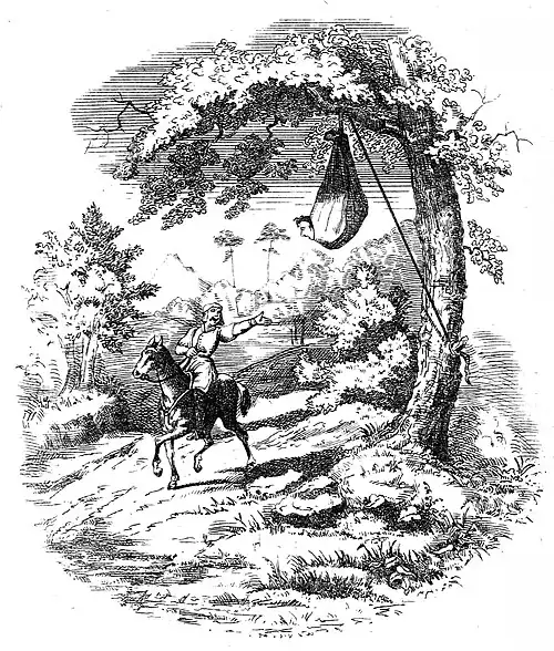 But whilst they were getting all ready, they heard the trampling of a horse at a distance, which so frightened them that they pushed their prisoner neck and shoulders together into a sack, and swung him up by a cord to the tree, where they left him dangling, and ran away. Meantime he worked and worked away, till he made a hole large enough to put out his head.