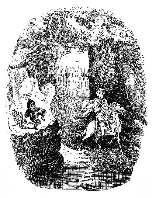 Then he set out, and when he had gone on his way some time he came to a deep valley overhung with rocks and woods; and as he looked around there stood above him on one of the rocks a little dwarf, who called out to him and said, "Prince, whither hastest thou so fast?" "What is that to you, little ugly one?" said the prince sneeringly, and rode on his way. But the little dwarf fell into a great rage at his behaviour, and laid a spell of ill luck upon him, so that, as he rode on, the mountain pass seemed to become narrower and narrower, and at last the way was so straitened that he could not go a step forward, and when he thought to have turned his horse round and gone back the way he came, the passage he found had closed behind also, and shut him quite up; he next tried to get off his horse and make his way on foot, but this he was unable to do, and so there he was forced to abide spell-bound.