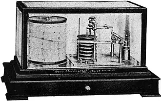 Aneroid Recording Barometers.—Recording aneroids are sold under various copyrighted names; in Weather Bureau cant such an instrument is known as a barograph. The essential feature is one or more vacuum chambers, a drum moved by a clock, and a ruled sheet of paper on which the record is made. The better type of barograph has a battery of eight vacuum chambers, one upon the top of another. This arrangement permits the movement due to pressure to be multiplied eight-fold. A finer adjustment and a more accurate record is gained thereby. Temperature compensation is effected by the admission of a measured quantity of dry air into one of the chambers.