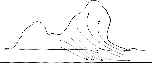Experiments have shown that a blast of air driven against drops of distilled water, with a force sufficient to blow them into spray, produces both positive and negative electricity—three times as many negative as positive electrons.[4] It has been found also that a velocity of 25 feet (8 meters) per second, or more, will cause the larger drops to be shattered and beaten into spray.[5] That is, if the drops falling in still air reach a velocity of 25 feet per second, they will be broken into smaller drops; or if the updraught exceeds 25 feet per second, the drops cannot fall against it; they will be shattered and carried upward until the velocity of the updraught is much reduced.