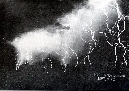 - ↑ Mr. George Reeder and his assistant Mr. Seaton of the Weather Bureau Station, University of Missouri, describe an instance of ball lightning, as “a pale red, slightly corrugated ball, apparently about 2 inches in diameter, moving across a space of about 6 feet between the telephone and a window. The ball seemed to float as a liquid bubble does, though it seemed solid. It kept a fairly straight line for the window; it rolled over the window sill and disappeared—not into the outer air, but by flickering out as a bubble does. There was no explosion or sound of any kind except a click of the telephone; there was no odor nor mark of any kind on the window sill.”