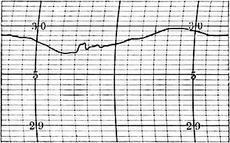 Pressure Waves.—The accompanying barogram, recorded at the Mount Vernon Meteorological Laboratory, illustrates pretty clearly the progress of a thunder-storm. The barometer had fallen steadily for more than twelve hours preceding the storm; and this continued until well along in the afternoon. The slight rise of the barometer in the morning is the diurnal pressure wave. The jump in pressure in the afternoon is the characteristic “thunder-storm nose” which usually is found on barograph records of thunder-storms. An expert observer does not need to refer to his daily reports to find the records of thunder-storms; the barograms show them in most instances. The rise in pressure occurs when the descending wind lifts the warmer air above it. A second “nose” appears about