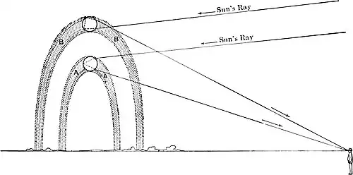 Rainbow.—The rainbow against a dark gray background of cloud is one of the most beautiful objects in nature. It may be seen as a full circle against spray thrown into the air, or against a mist. The rainbow of the summer shower consists of a bright arc near the horizon and usually a fainter arc above. The radius of the bright, or primary bow is about 42 degrees of arc; that of the upper or secondary bow is not far from 52 degrees of arc.