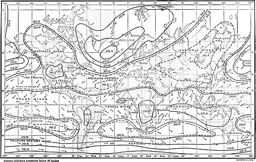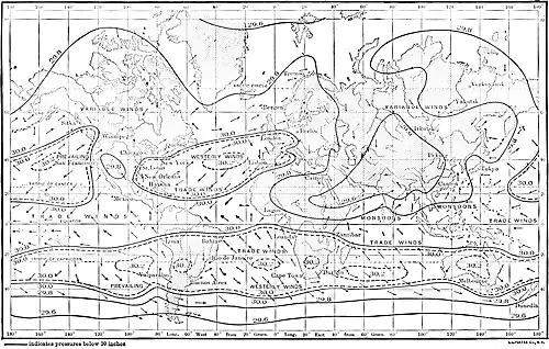 The zone of ascending air currents in equatorial regions is a region of low pressure. Its mean, summer and winter, does not vary much from 29.80 inches (1009 mb). Indeed, the changes in pressure from month to month throughout tropical regions are very slight. The ascending currents in equatorial regions and the descending currents near the tropics are assumed to exist. Their existence, established circumstantially rather than positively, explains satisfactorily the position of the constant highs and lows.