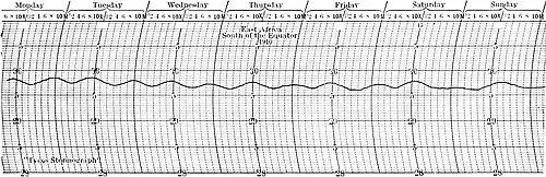 The semi-diurnal maxima and minima are greatest in equatorial latitudes; they decrease in higher atitudes. According to the observations of General Greely, the oscillations of the barograph pen were scarcely noticeable in polar regions. The amplitude of oscillation is greater by day than by night; it is greater at the equinoxes than at the solstices. The day amplitude is greater over the continents than over the sea; the night amplitude is the reverse. According to Humphreys, the whole atmospheric shell vibrates in waves which happen to be in 12-hour wave lengths. Records made by P. R. Jameson on the East African Coast near the equator show a maximum of about 0.025 inch above and the same minimum below normal pressure.[3] In tropical regions the irregular variations in pressure are infrequent; the semi-diurnal oscillations, on the other hand, are very regular. The claim that an observer can tell the time of day by the barometric pressure is not without foundation.
