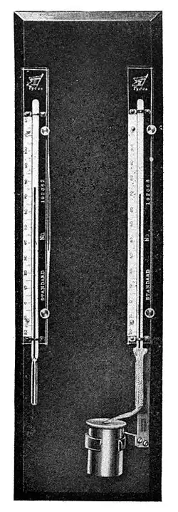 Mason Hygrometer. Weather Bureau pattern. vary. The instrument consists of two thermometers mounted on the same base. One measures the temperature of the free air; the bulb of the other is covered with a single thickness of thin bolting silk or muslin, the lower end of which is in a small vessel of water attached to the baseboard. Capillary attraction keeps the fabric wet and evaporation is almost always taking place.
