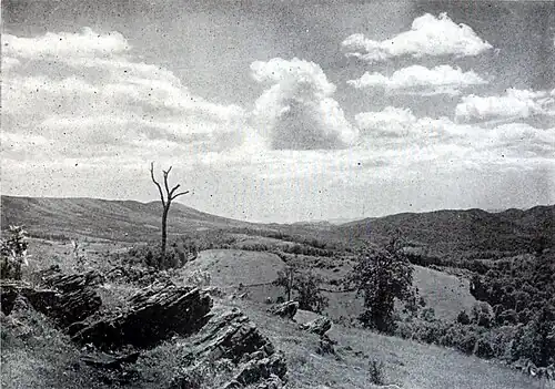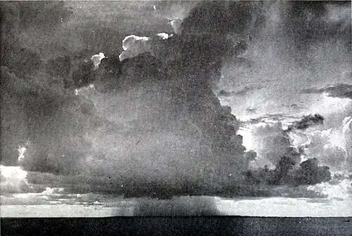 A summer shower. Cumulo-nimbus belt, the front of an advancing wedge of cold air, overlying warm air next the ground, showing thunder-head (right); strato-cumulus rolls (center), Mount Weather, Va.