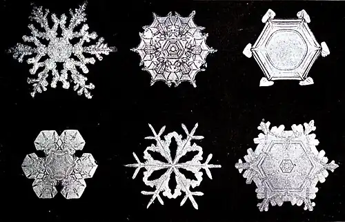 - ↑ A remarkable collection of photographs of snow-flakes has been made by W. A. Bentley, and another by J. C. Shedd. The latter is published in the Monthly Weather Review, October, 1919. Professor Shedd classifies snow-flakes as first-, second-, and third-growth crystals. They have been classified also as columnar, doublets, and pyramidal crystals.