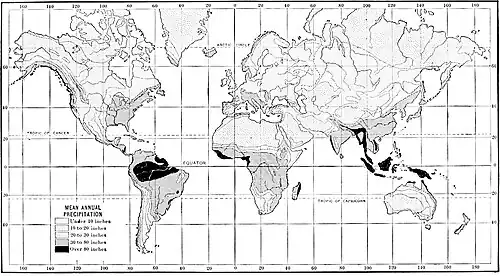 South of the equator the zone of constant rains is not so well marked as it is north of the equator; moreover, the belt of easterly winds at times covers the whole of the Gulf of Mexico. In general, the lands of the Torrid Zone receive an average of about ioo inches of rain per year—rather more in the northern than in the southern part.
