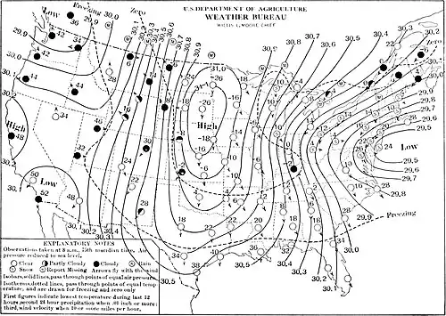 existed; it will show the areas of clear, cloudy and windy conditions. The man in Chicago may learn at a glance the weather conditions at Los Angeles, New York City, Winnipeg, Key West, Bermuda, or Havana. A merchant who has shipped perishable goods may learn whether or not his consignments are threatened by washouts, snow blockades, or cold waves. In other words, the daily weather map is very much more than a mere bird’s-eye view of the air and its conditions; it is a survey—a topographic map—with measured values.