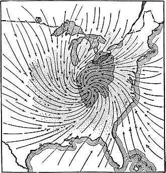 Secondary Storms; Tornadoes.—When a whirlpool forms in a stream, smaller whirlpools almost always occur near its edge. These secondary whirls result from the formation of the larger whirl. Similarly, secondary whirls of the air are very apt to accompany the cyclonic storms which pass over the Great Lakes and down the St. Lawrence Valley. In the winter the secondary storms thus formed appear along the Virginia coast, or perhaps to the north of it, and move north or northeast with heavy snow squalls and high, gusty winds. In the summer they are attended by hailstorms, thunder-storms and tornadoes. These occur usually on the south or the southeast side of the low.[3]