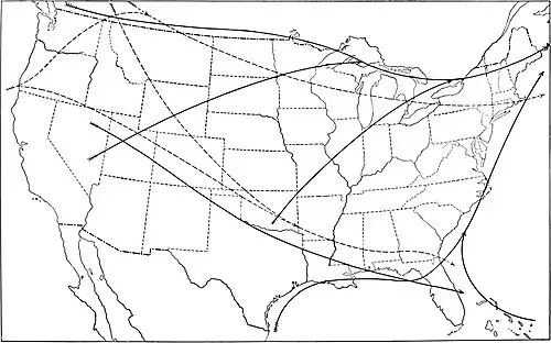 Storm tracks of the United States: Heavy arrows, cyclones; broken arrows, anticyclones.