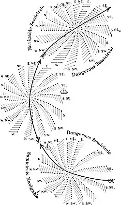 - ↑ It is not unlikely that the eccentricity of the ellipse of the cyclonic storm depends on the velocity of the whirl—the higher the wind-velocity, the more nearly it approaches a circular form.