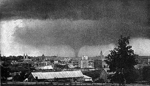 Lake Gervais tornado, July 1, 1890, as seen from St. Paul. Note the mass of air as shown by the upper cloud overrunning the warm surface air.